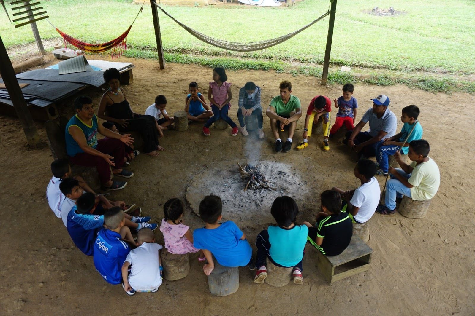Cantos de la Tierra is a cultural and educational center for local children located in Mocoa-Putumayo. Here: Taita Manuel, volunteers, and children from the region.
