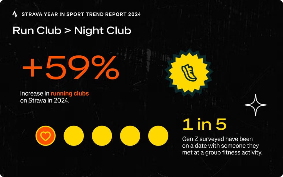 Strava's 2024 data tells the whole story: 58% made new friends through fitness groups, while nearly 20% of Gen Z dated someone they met through exercise. They're four times more likely to choose a workout over a bar for meeting people.